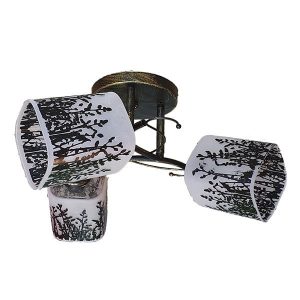 Kinzig es una hermosa lampara de techo metálica color bronce envejecido, con tres tulipas de vidrio blancas con bellos diseños en color negro, cada tulipa contiene un soquete para ampolletas tipo E27 (no incluidas) en las que se recomienda las modelo A60 LED.