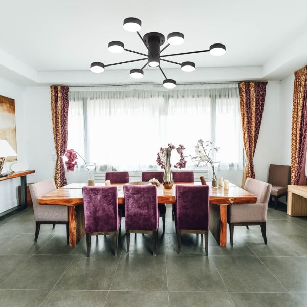 Tripoli es una moderna y muy decorativa lámpara LED de techo de cuerpo metálico color negro, con sus 43 W de potencia puede iluminar un espacio de aproximadamente 21 m2, la particularidad de esta lámpara es que ilumina con luz cálida, fría y día con solo apagar y encender el interruptor.