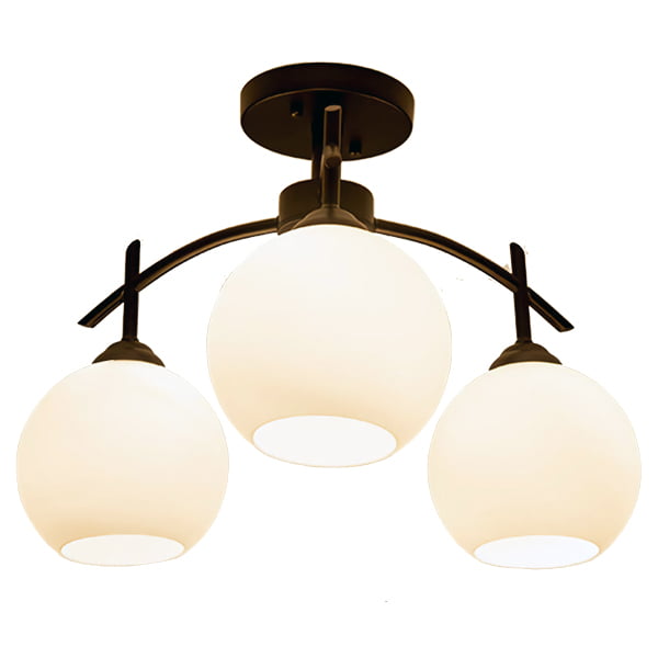 Yuko es una simple, hermosa y decorativa lámpara de techo de cuerpo metálico color negro, tiene tres tulipas de vidrio color blanco esfumado en forma de bola de 14 cm de diámetro, cada una contiene un soquete de tipo E27 donde se recomienda el uso de ampolletas LED modelo A60 (incluidas potentes A60 LED). La lámpara tiene un diámetro de 50 cm y una altura de solo 30 cm, haciéndola ideal para lugares donde el techo no es muy alto.